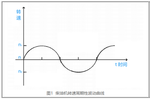 柴油机游车是指柴油机在指定转速下运转时转速发生周期性的波动(如图1所示),n为指定转速,n₁为上串转速,n₂为下跌转速,当n₁-n₂>20r/m时,造成柴油机运转的不稳定。游车的产生,主要与柴油机调速系统的工作状态相关联。调速系统的作用是控制柴油机的启动、升速、降速和停机,从而带动整台柴油发电机组启动、加速、减速和停止。调速系统由调速器与控制机构等组成。控制机构的作用是通过操作员的操控,带动高压油泵齿条伸长或缩短,增加或减少供油量,让柴油机在指定转速下运转。调速器的作用是当柴油机负荷发生变化时,自动调节柴油机高压油泵的供油量,使供油量与负荷相适应,从而保证柴油机稳定运行。经过调速器的作用,能够使柴油机在指定转速下稳定、可靠运转。如果调速系统动力过程稳定性不好,调节转速不能稳定在指定的转速,转速忽高忽低就会产生游车现象。